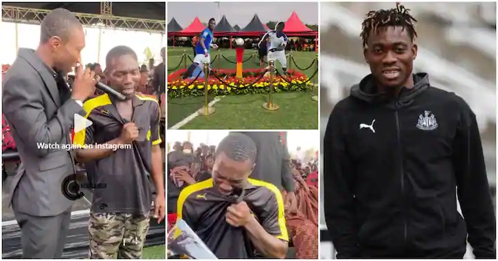 At the one-week memorial held at the Adjiringanor Astroturf, where family, friends, and sympathisers gathered to mourn the passing of the late Ghanaian footballer on Saturday, March 4, the ex-convict, who was wearing a jersey, prayed and asked a T-shirt of Christian Atsu.